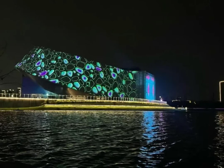 澎湃新闻了解到,此次中国(杭州)艺术与科技国际双年展的举办地为全新启幕的余杭美术馆。该美术馆坐落于杭州良渚新城玉湖综合体南侧水域的小岛上,建筑面积为6160平方米,于2024年竣工。馆身以双环同构的圆璧之形,营造出“悬浮”于天地之间的意象。馆体外立面采用了玉石玻璃和铝板的创新结合,在夜晚时分呈现360°动态投影。
